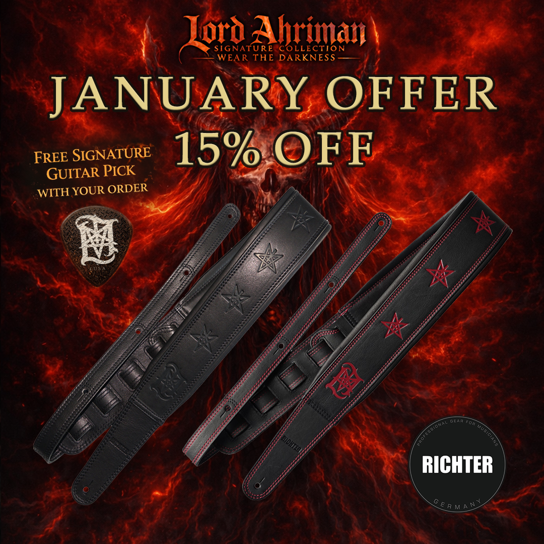 Unleash the darkness and carry the mark of Lord Ahriman with this premium handcrafted guitar strap. Designed for both style and comfort, this strap is made from the finest Italian Nappa leather, ensuring durability and a luxurious feel. Featuring an embossed pentagram and signature logo, this is the ultimate accessory for those who embrace the dark.
